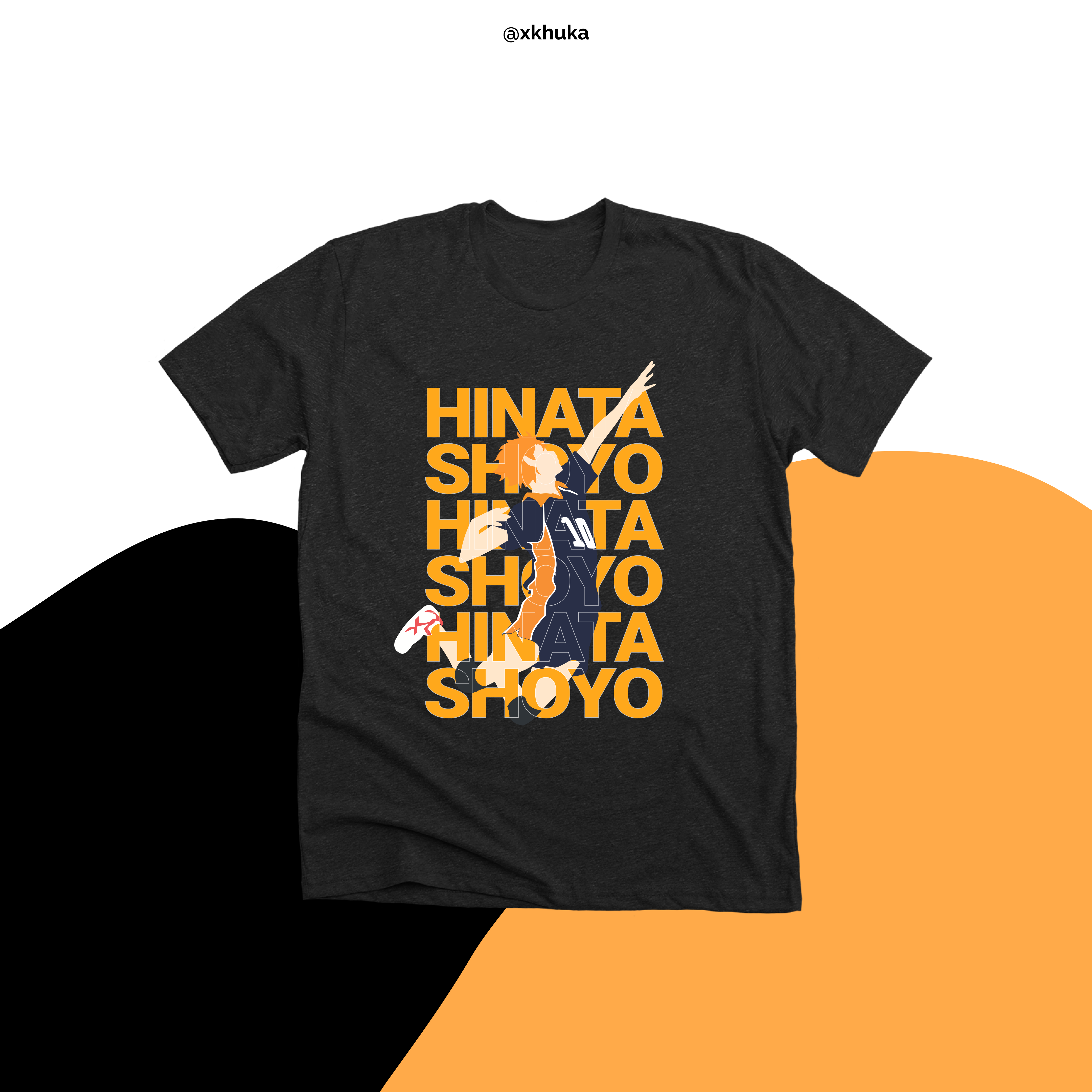 “This T-shirt features Hinata Shoyo from Haikyuu!! in a dynamic mid-air spike pose, with his vibrant orange hair capturing attention. The design keeps a clean and simple background, allowing Hinata to be the focal point, and includes his iconic jersey number ’10’. The bold orange, black, and white color palette makes the design stand out, offering a stylish and energetic look for fans of Karasuno High and the series.”